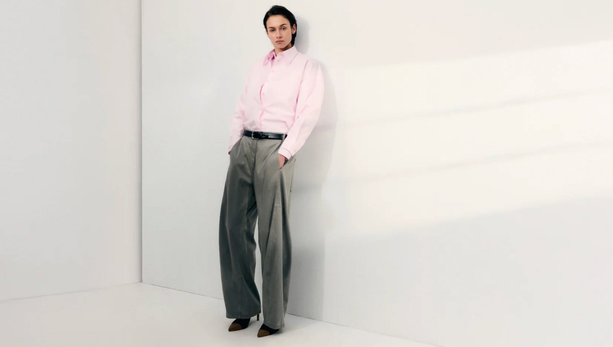 Olive trousers + pale pink knit + brown shoes. This combination is actually on Tibi’s homepage right now.