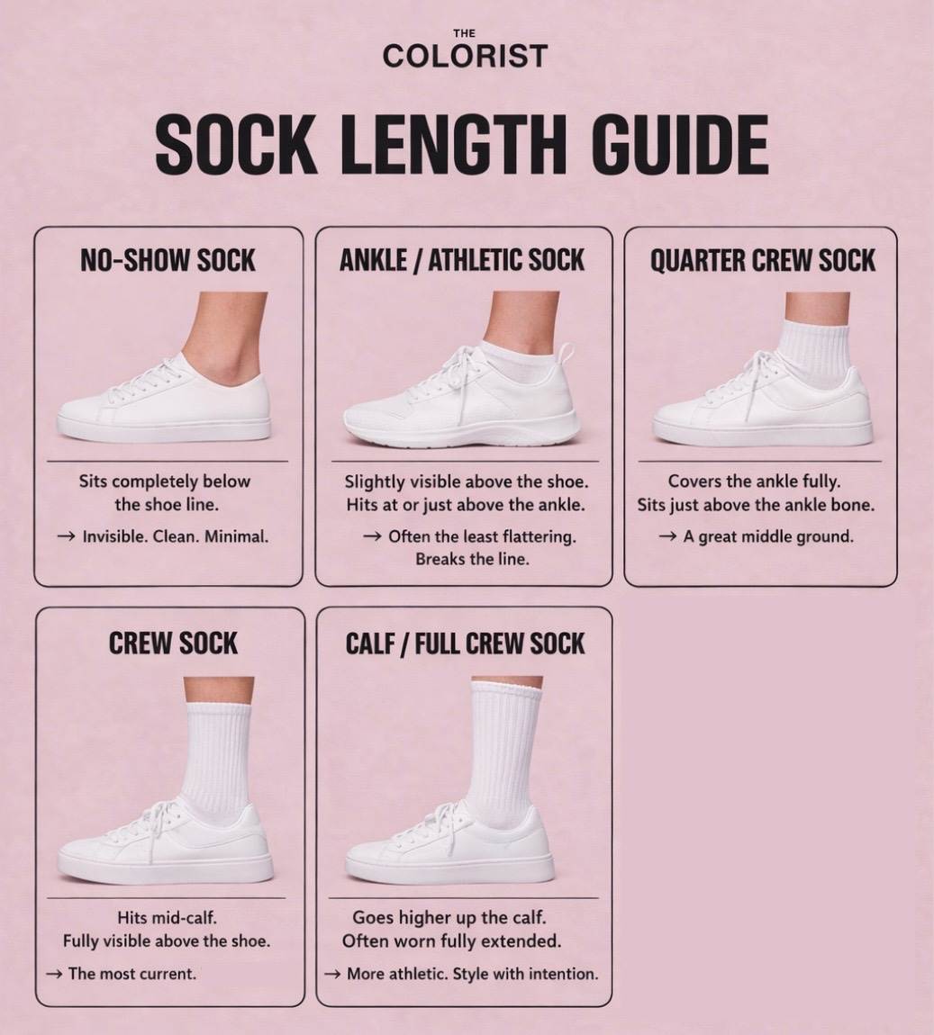 → The most current, styled choice right now. Instantly makes an outfit feel intentional and directional.Safe option: No-show sock.