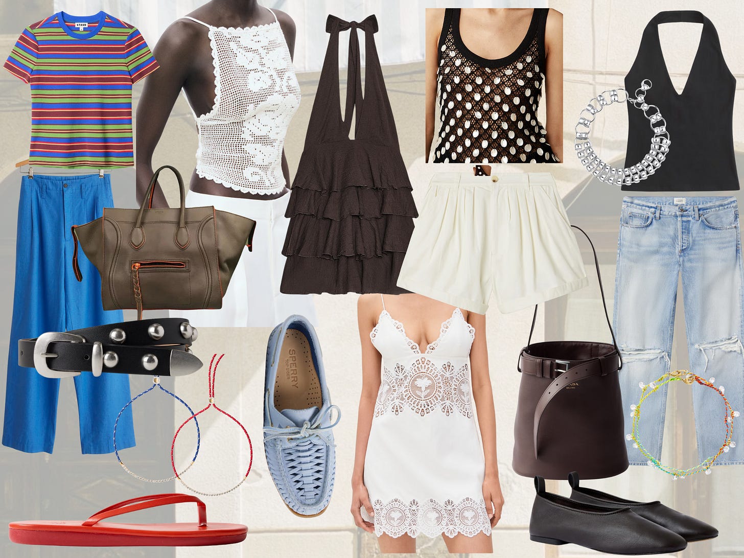 As we’ve seen, it’s a Doen white lace summer, and I loved this backless crochet top from Mango. A little more modern, but still delicate, like a doily. The brown ruffle dress looks like it could get a lot of wear from now through the end of the year. Easy to dress up with tights and boots or throw on for a summer vacation. Who doesn’t love a dress that can do both?